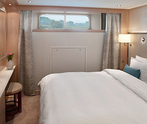 The Standard Staterooms provide guests a river view courtesy of the half heigh picture window. These Staterooms provide guests with hotel-style beds measuring 79 inches x 63 inches, with optional twin-bed configuration. Guests can expect a private bathroom with a shower and premium bath products, with bathrobe and slippers available on request.Standard Staterooms also provide guests with a telephone, small refrigerator and a safe for belongings. Bottled water is replenished daily and the rooms are fitted with individual climate control to suit any passengers requirements.There is plenty of space under the bed for storing suitcases as well as a roomy wardrobe complete with wooden hangers. The Staterooms are fitted with 220V and 110V power points and a Sony 40-inch flat-panel TVs with premium entertainment package including: BBC News, CNBC, CNN, National Geographic, TNT Series, Sky Sports, videos on demand and “View From the Bridge”.