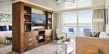 With a generous 405 sq. ft. of relaxing space, each Veranda suite provides the perfect balance of comfort and luxury. Be treated to a fruit and cheese plate when you arrive and cheers with a complimentary bottle of premium champagne as you begin your adventure. Considered one of the finest staterooms on any cruise ship, guests will enjoy full-size bathrooms and a large living area complete with sliding glass door. Your in-suite mini-refrigerator will be fully stocked and replenished throughout your cruise with juices, waters, white and red wine. All suites include a private walk-out balcony where you can enjoy “suite treats” delivered to you each evening and take in the breathtaking views.