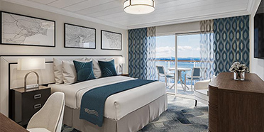 With a generous 405 sq. ft. of relaxing space, each Veranda suite includes a private walk-out balcony to enjoy the panoramic views. Considered one of the finest staterooms on any cruise ship, guests will enjoy full-size bathrooms and large living area with sliding glass door.