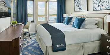 Located on the third deck, these spacious staterooms feature commanding views of the passing river landscapes. At 350 sq. ft., there is plenty of room to enjoy the tasteful comfort of your surroundings. These staterooms have all the comforts of a fine hotel and feature floor-to-ceiling sliding glass doors with a private balcony to offer panoramic views from every angle.